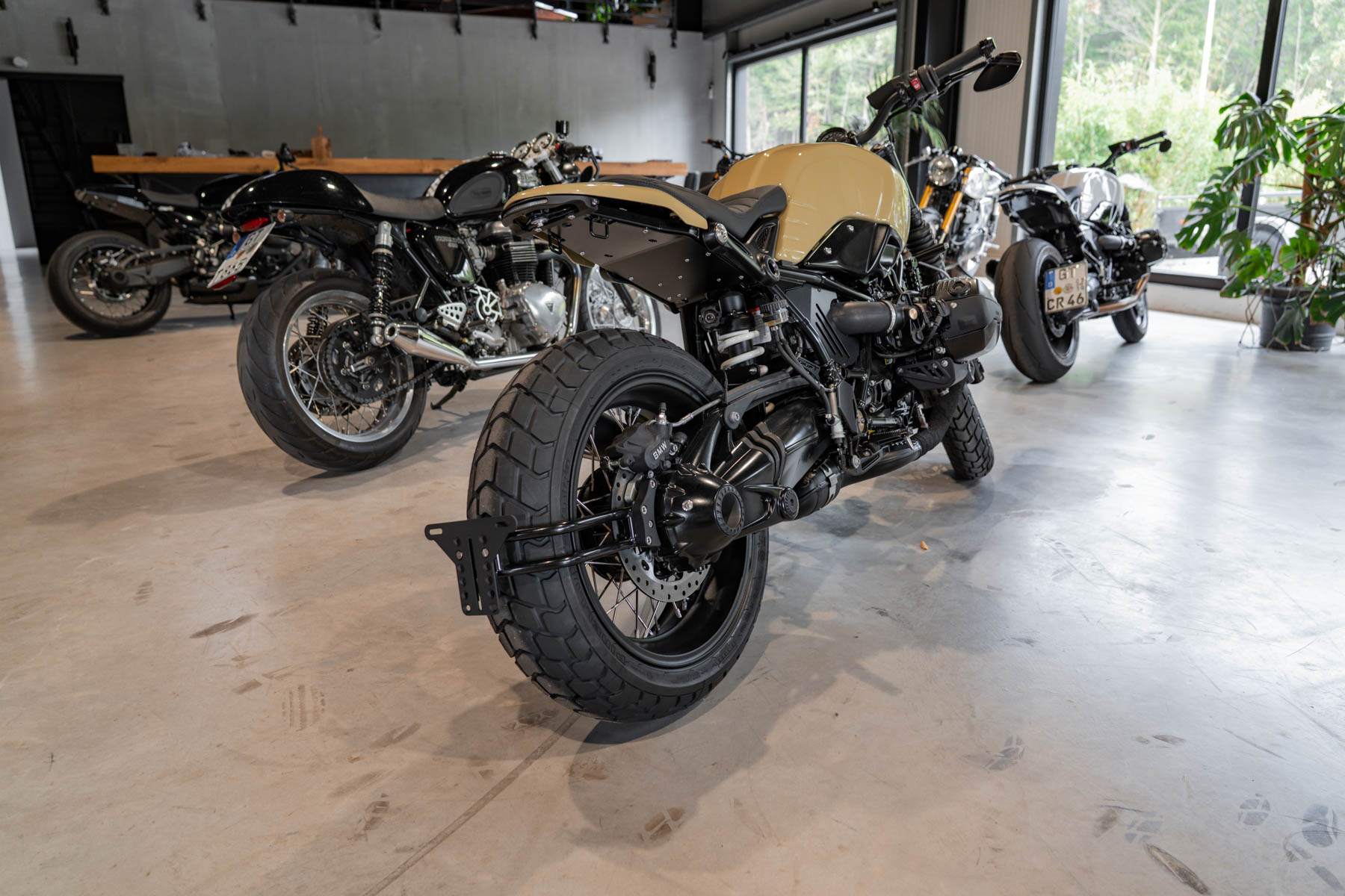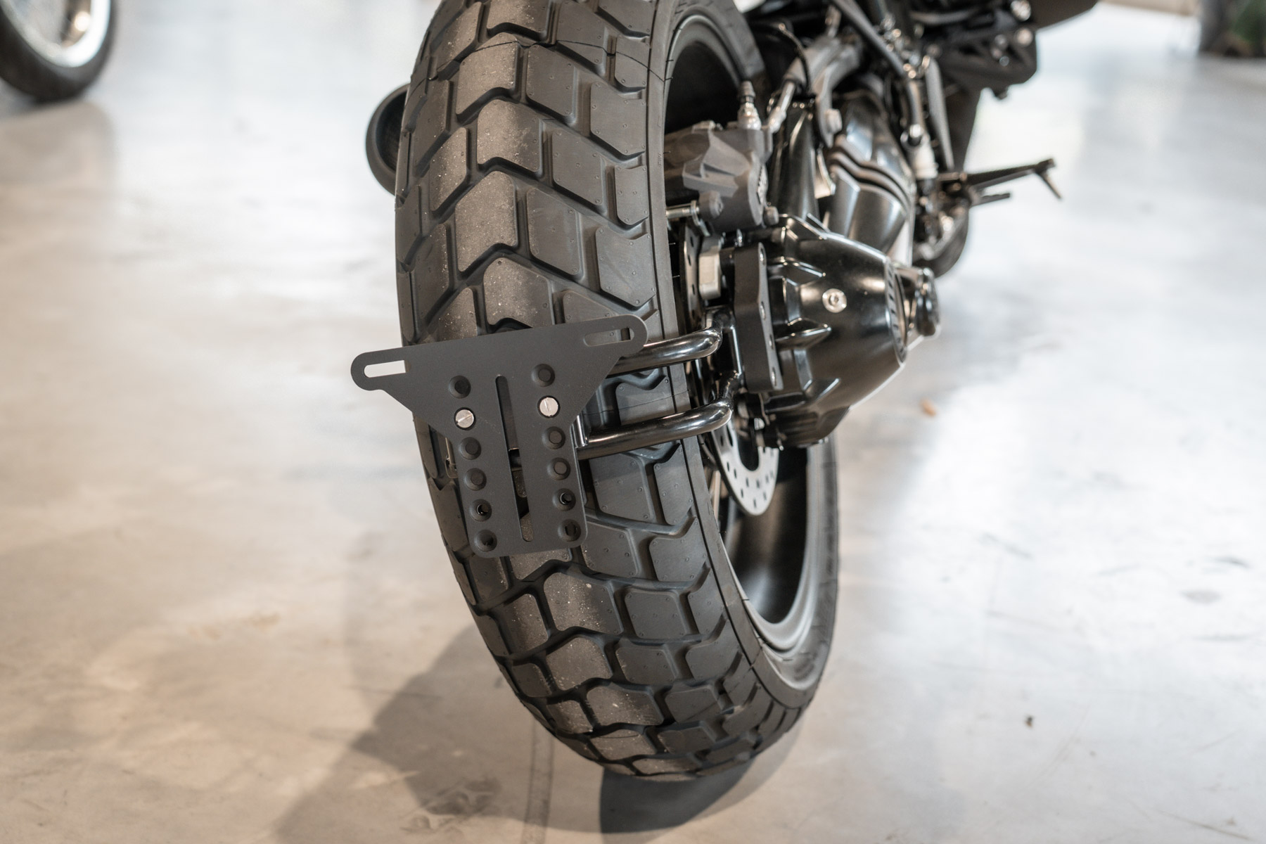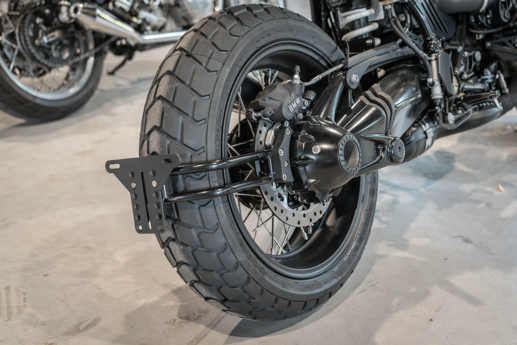 Side licence plate holder behind the rear wheel for BMW R nineT & R12 models.