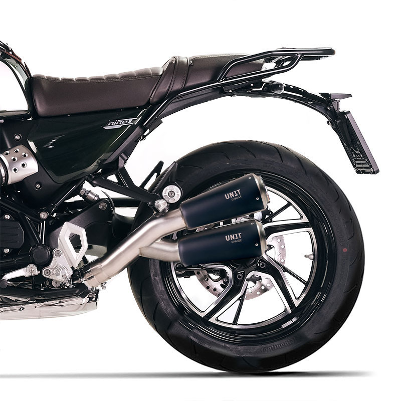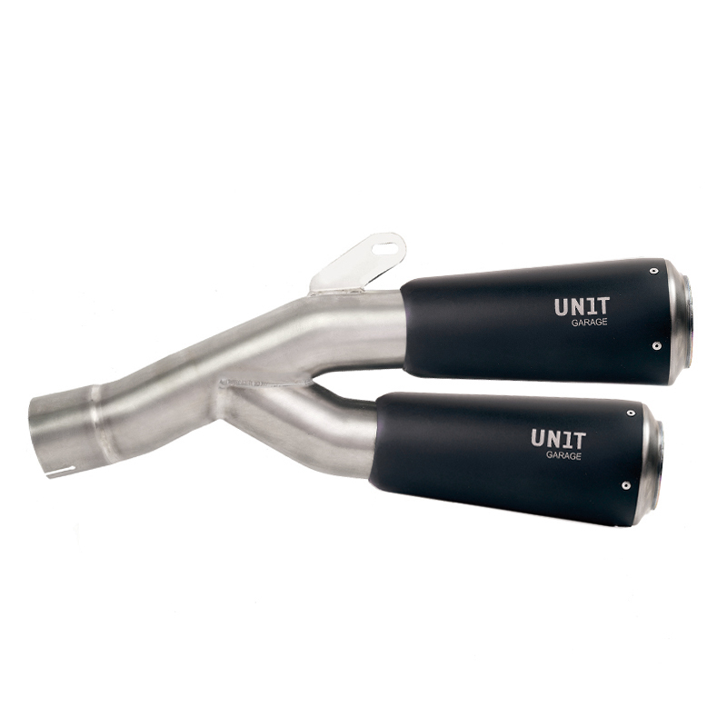 The bottom-mounted dual exhaust from the Italian company Unit Garage is a slim and beautifully short exhaust in the classic cafe racer look with two exhaust silencers.