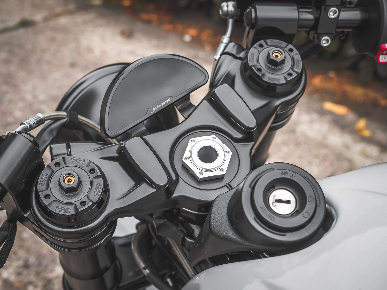CNC machined aluminum cover for the steering head nut of all BMW R nineT models.