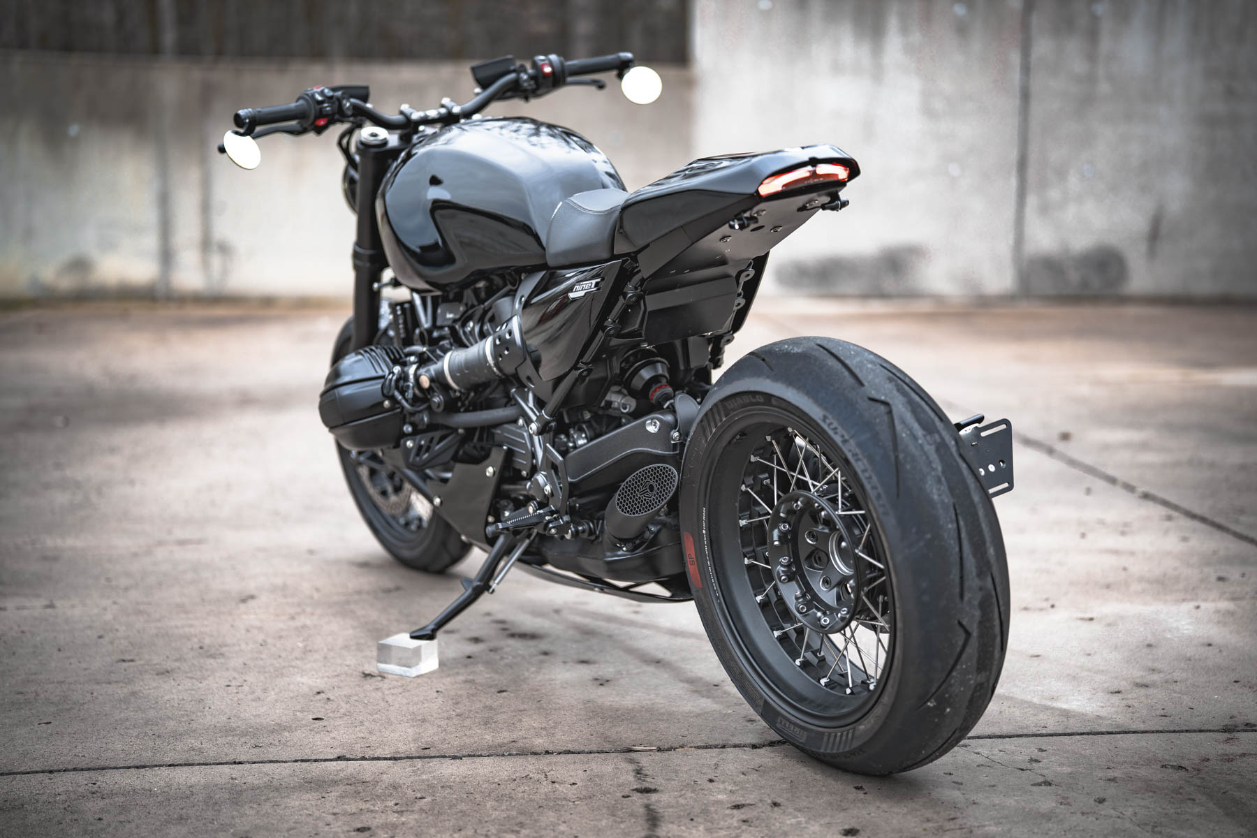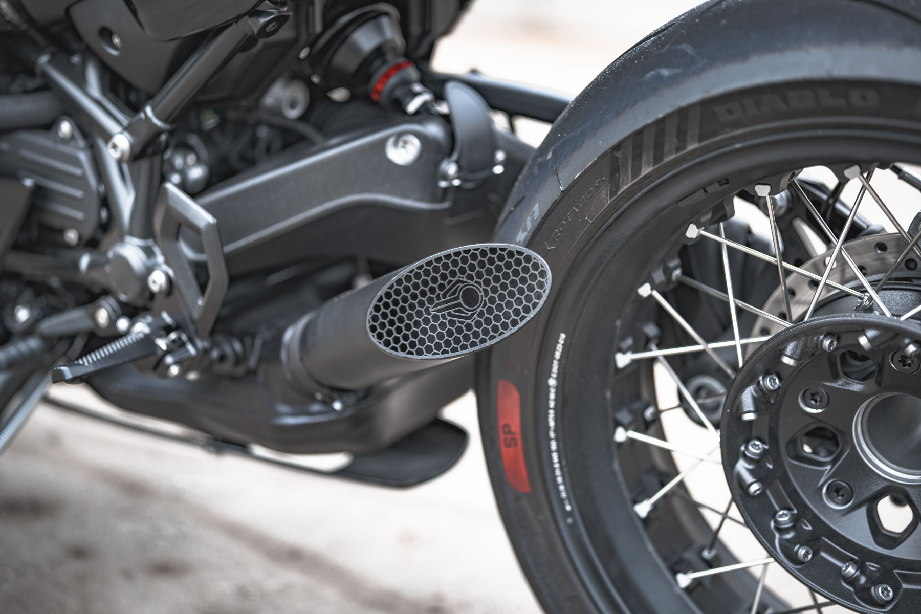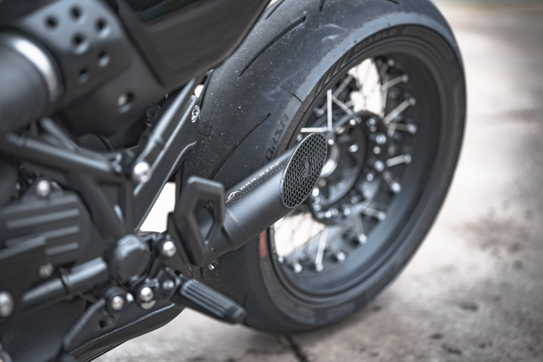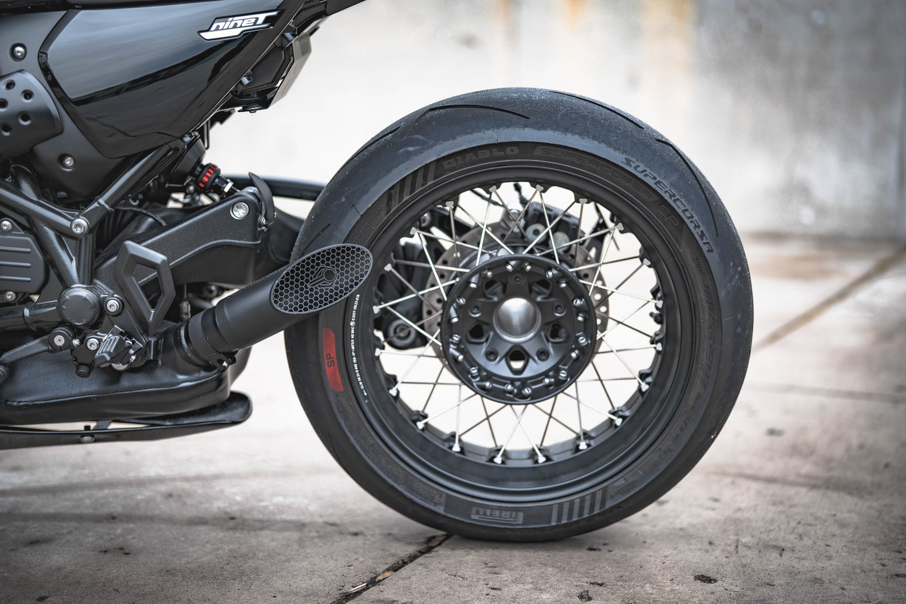 A really short and crisp slip-on exhaust that really emphasises the beautiful rear wheel rim of the motorbike.