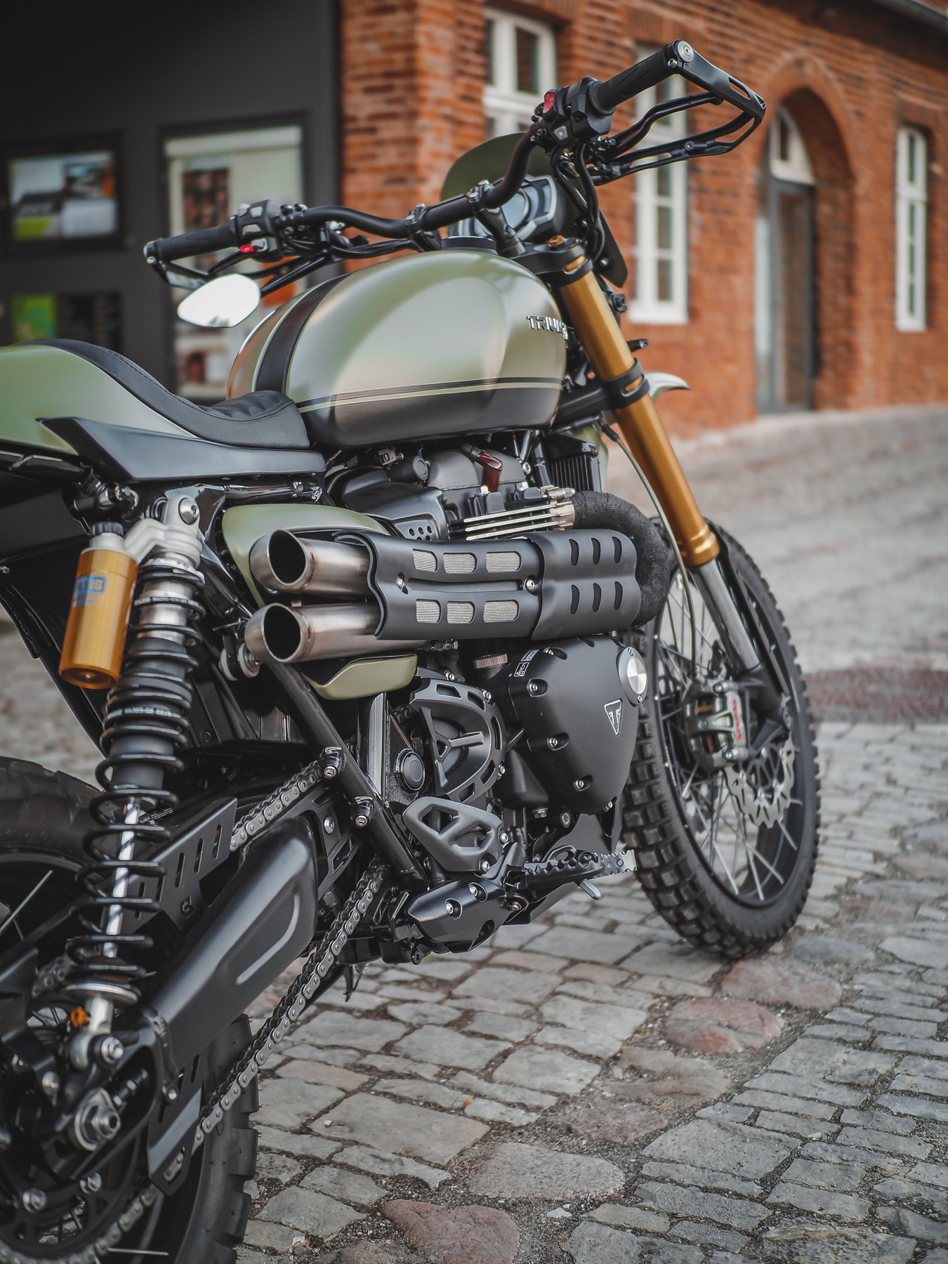 The short side-pipe design looks mega, and the sound is really nice and muffled, bassy and typically Scrambler. Our opinion: It sounds best without the DB-killer - then the Scrambler simply bubbles divinely. But even with the killer, the system does a really good job.