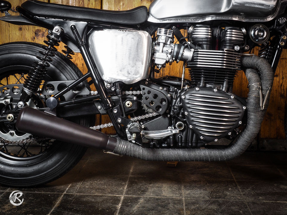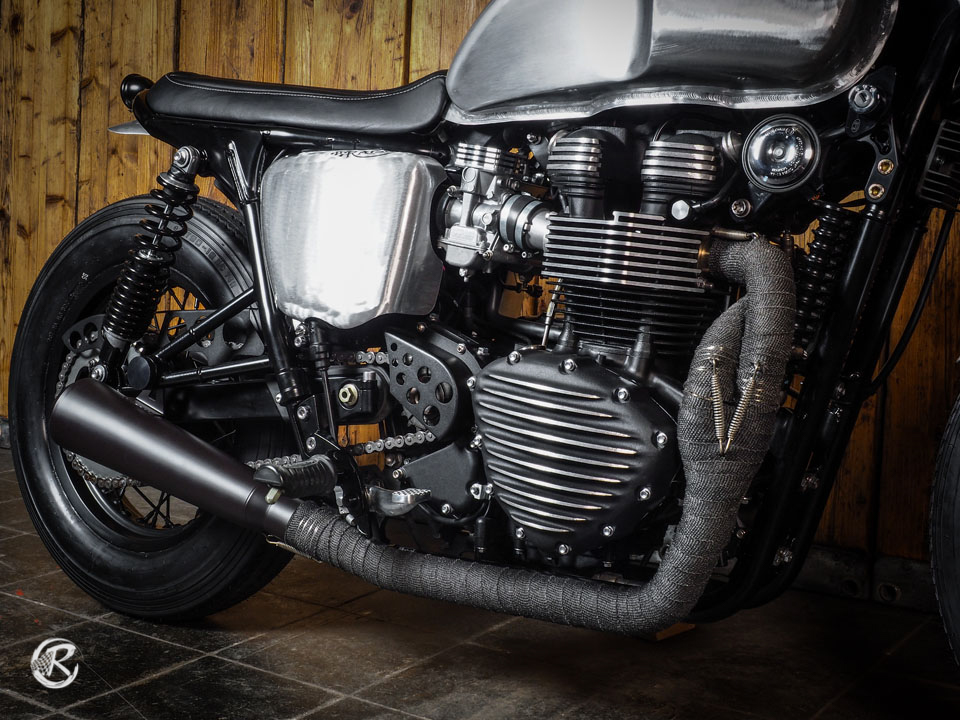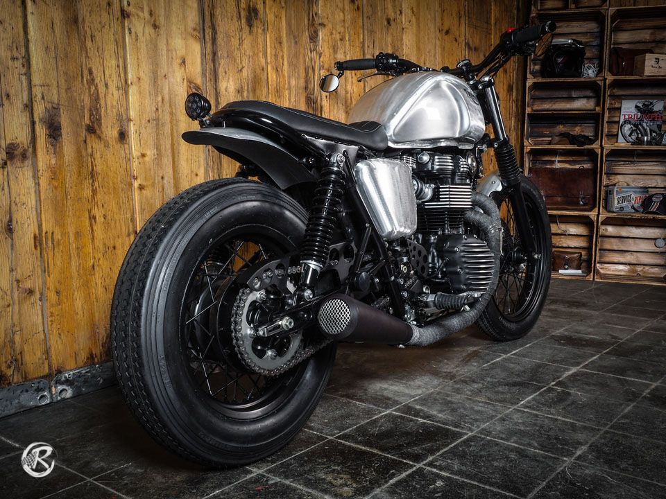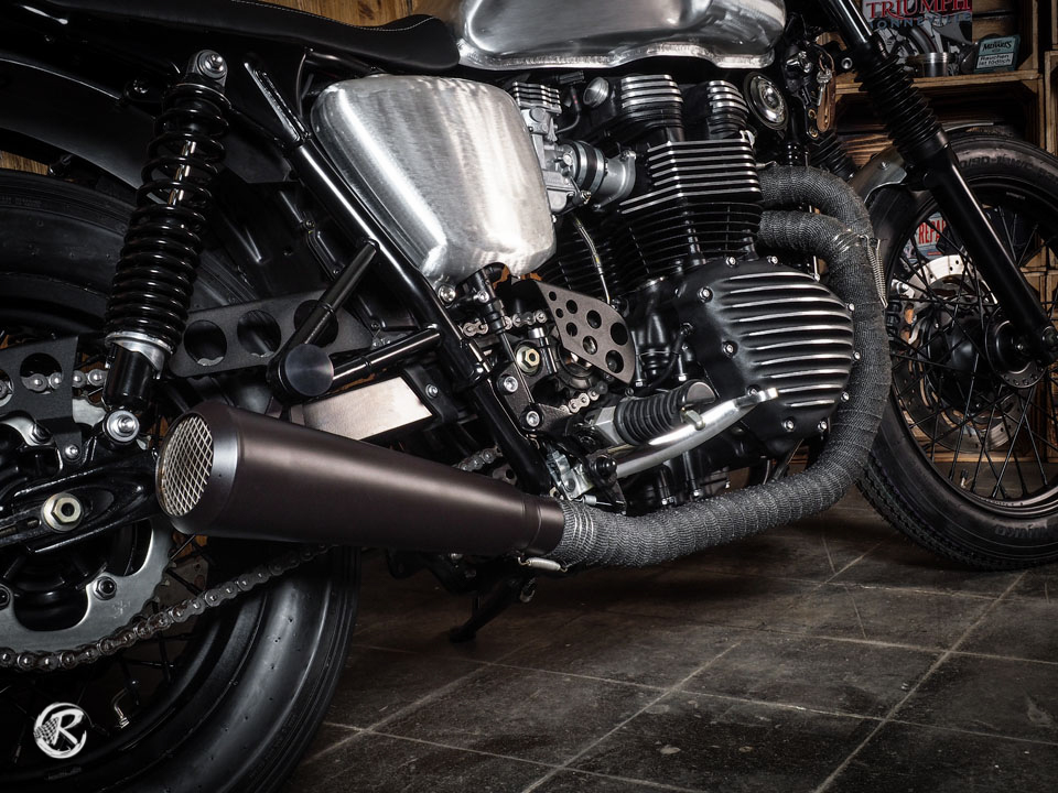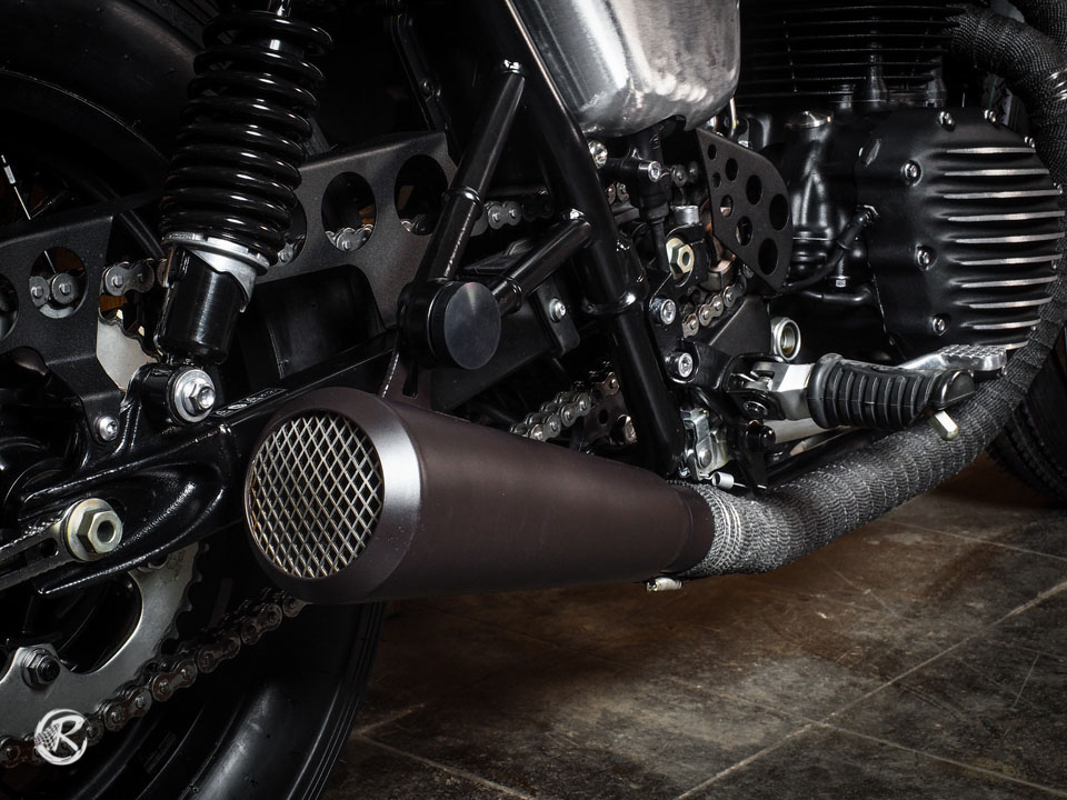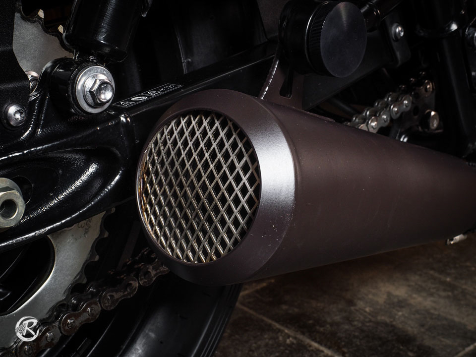 El sistema 2-1 proporciona un sonido gutural que no es demasiado fuerte. Por supuesto, el escape se centra en el aspecto. El silenciador trasero bellamente corto con la rejilla integrada simplemente se ve muy bien. El aspecto corto le da a tu Triumph una apariencia totalmente nueva.