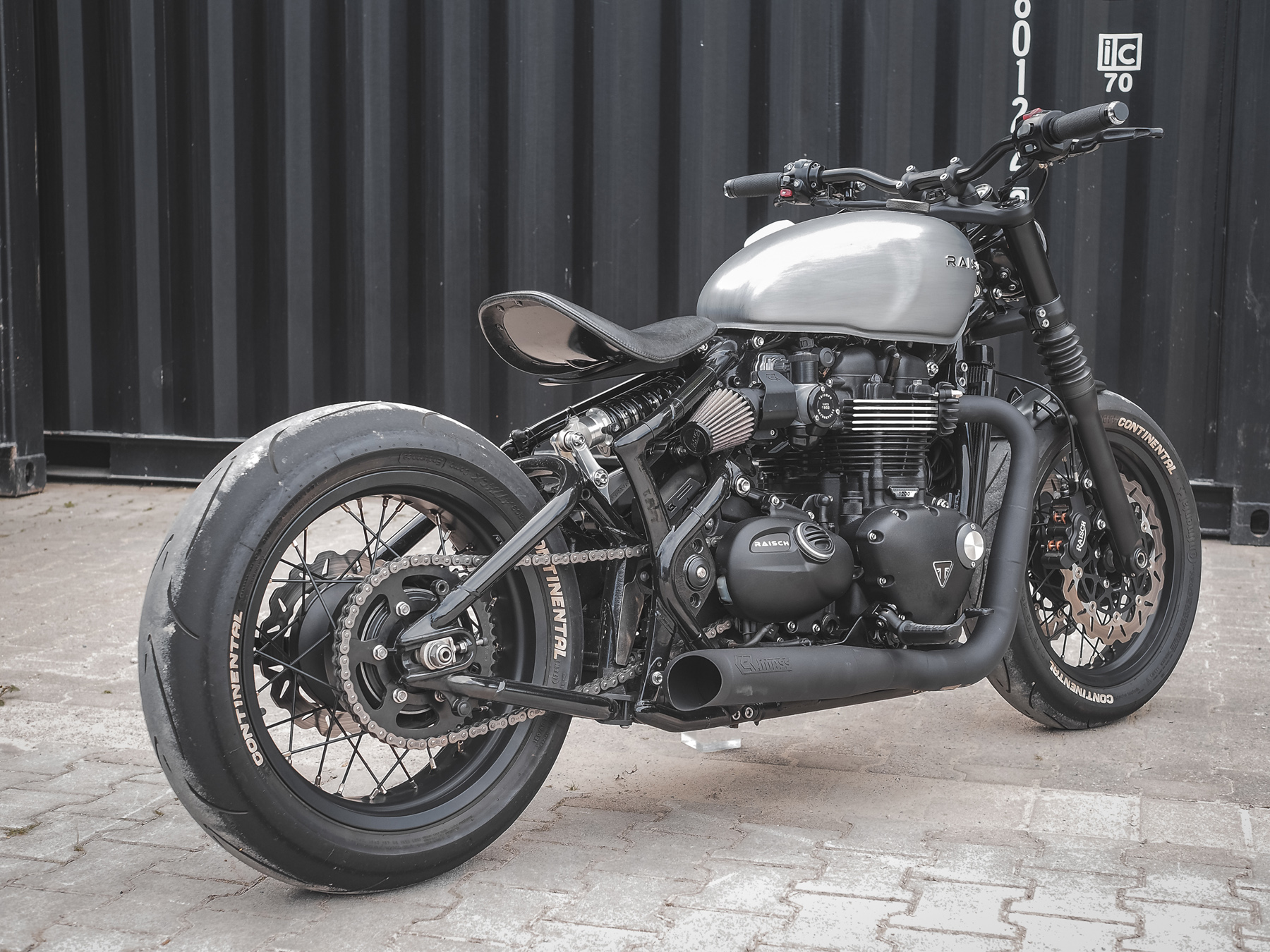 Sistema completo exclusivo Classicbike-Raisch x Mass 2-2 de acero inoxidable en diseño Side Pipe - Hot Rod, con número E / homologación para carretera.