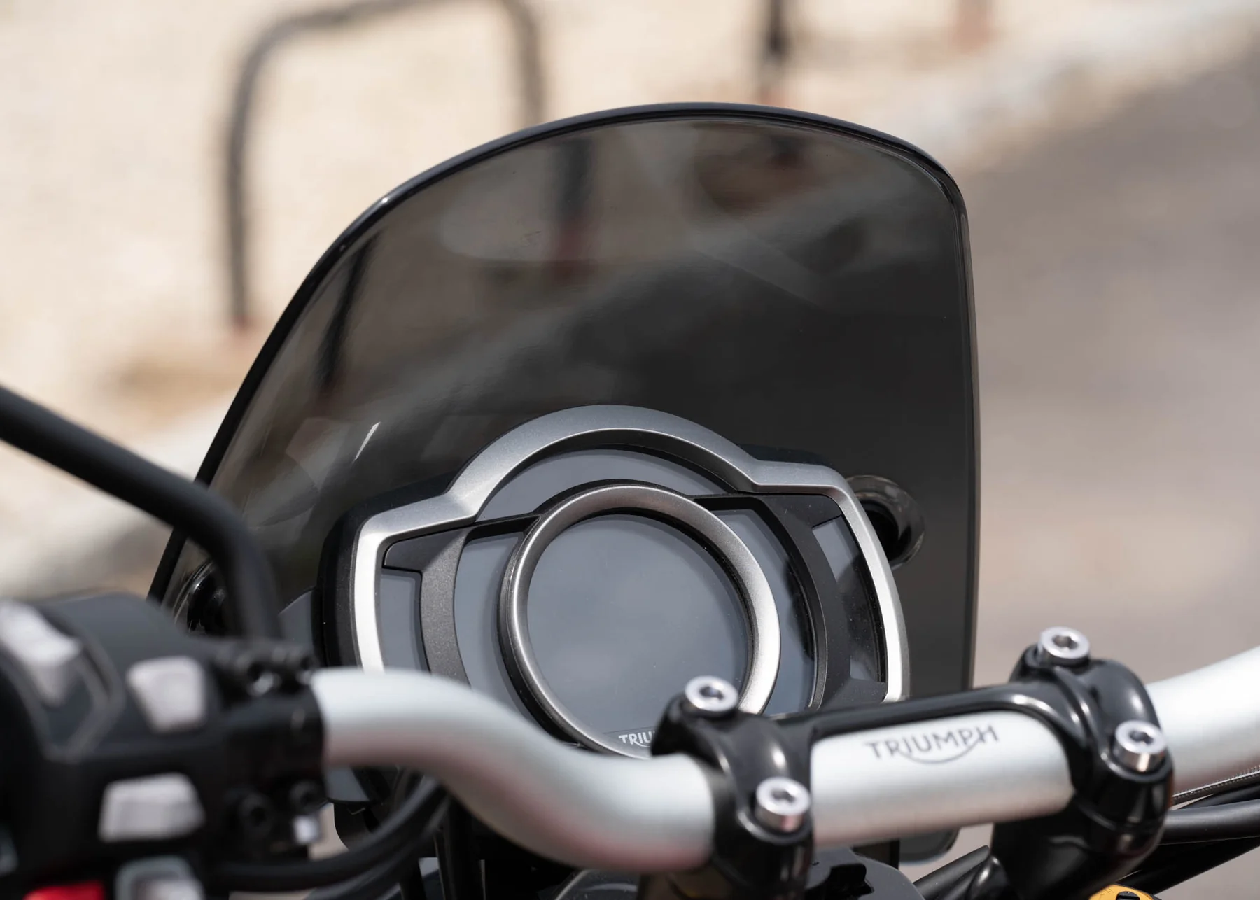 El parabrisas no sólo añade un acento visual a la parte delantera de la moto, sino que también proporciona una notable protección contra el viento.