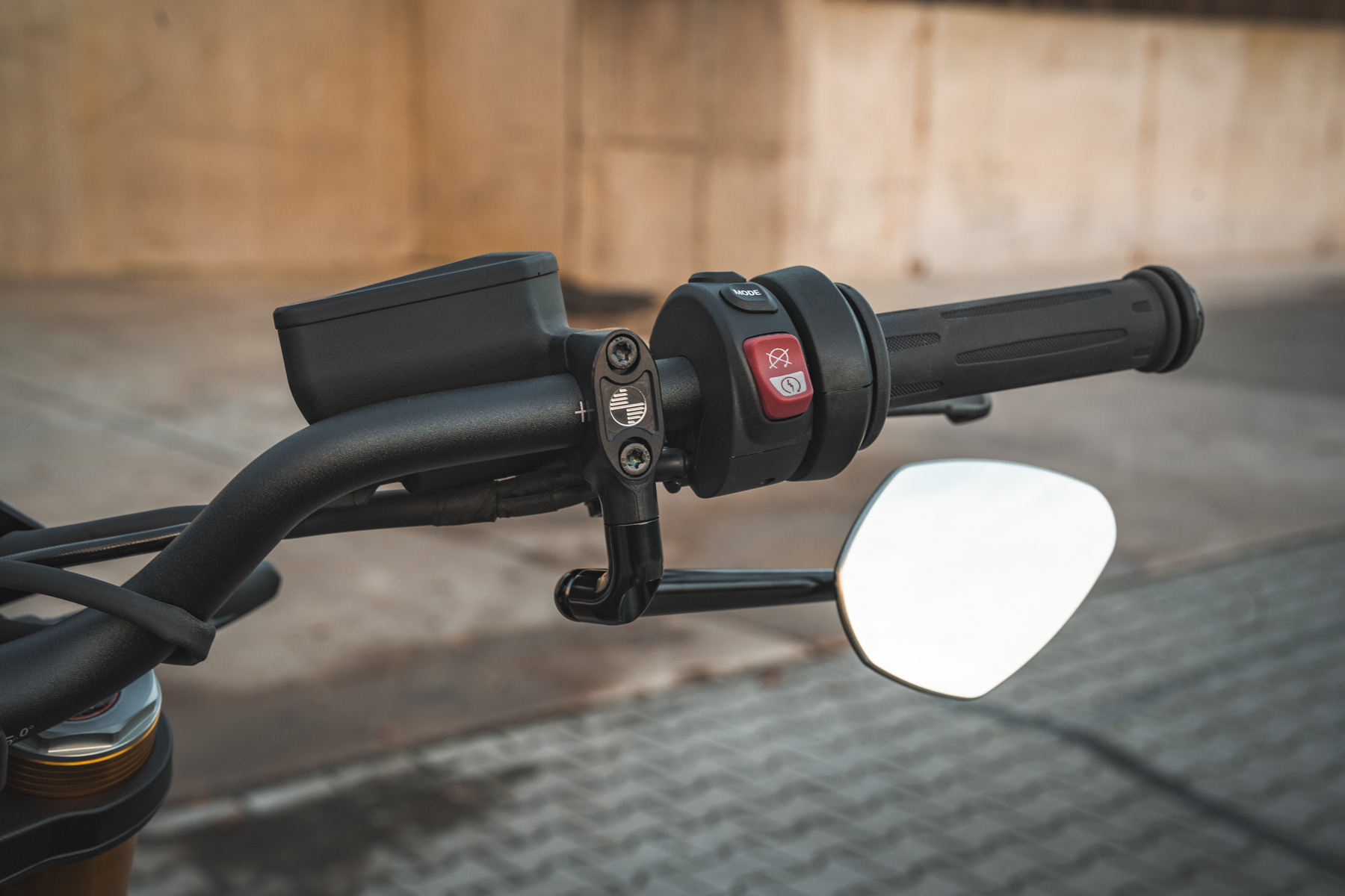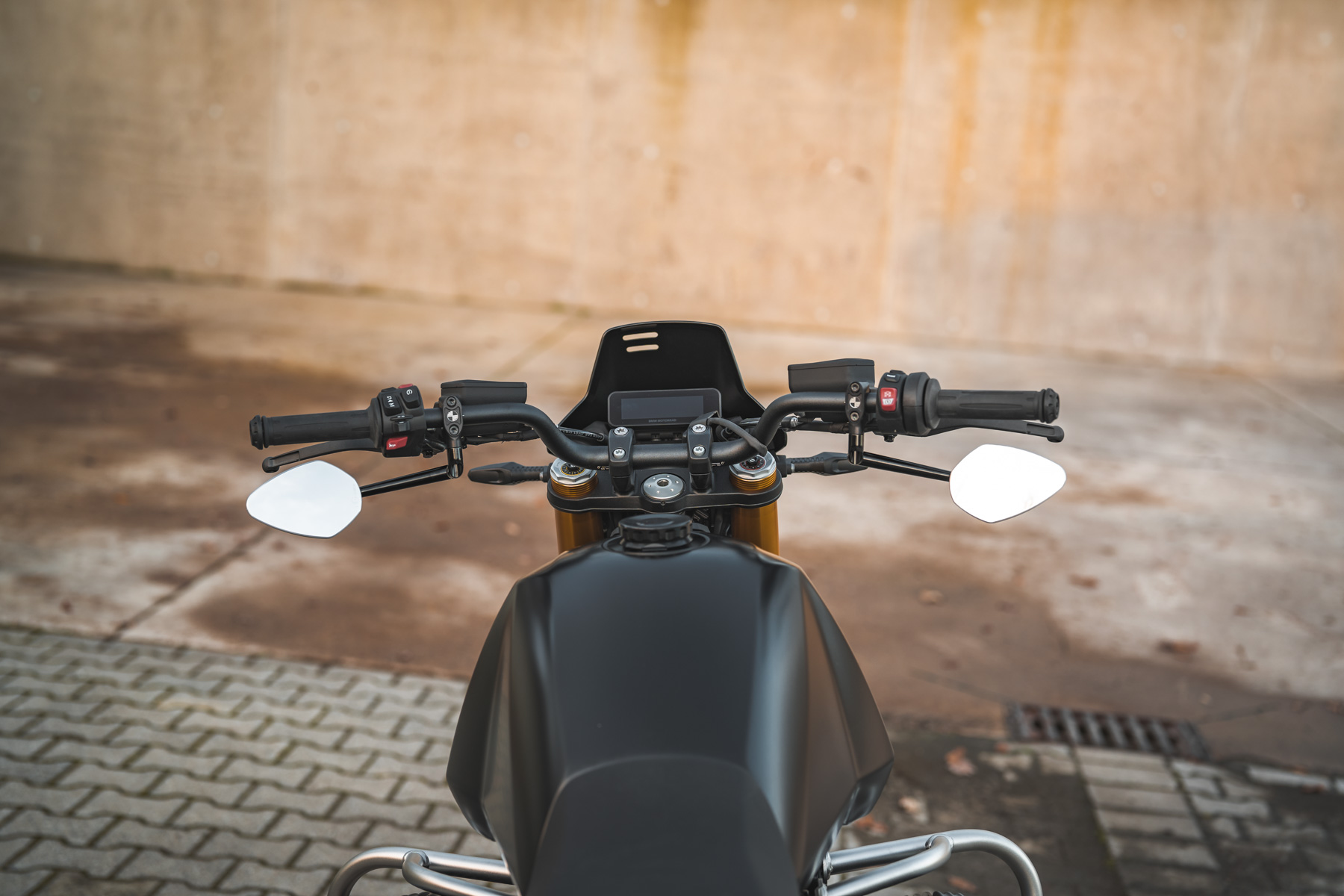 Le kit comprend un rétroviseur sans miroir Motogadget (plus de détails ci-dessous) et un adaptateur de rétroviseur fraisé CNC, qui est nettement plus bas que l'original. Tu as le choix entre quatre variantes de miroir