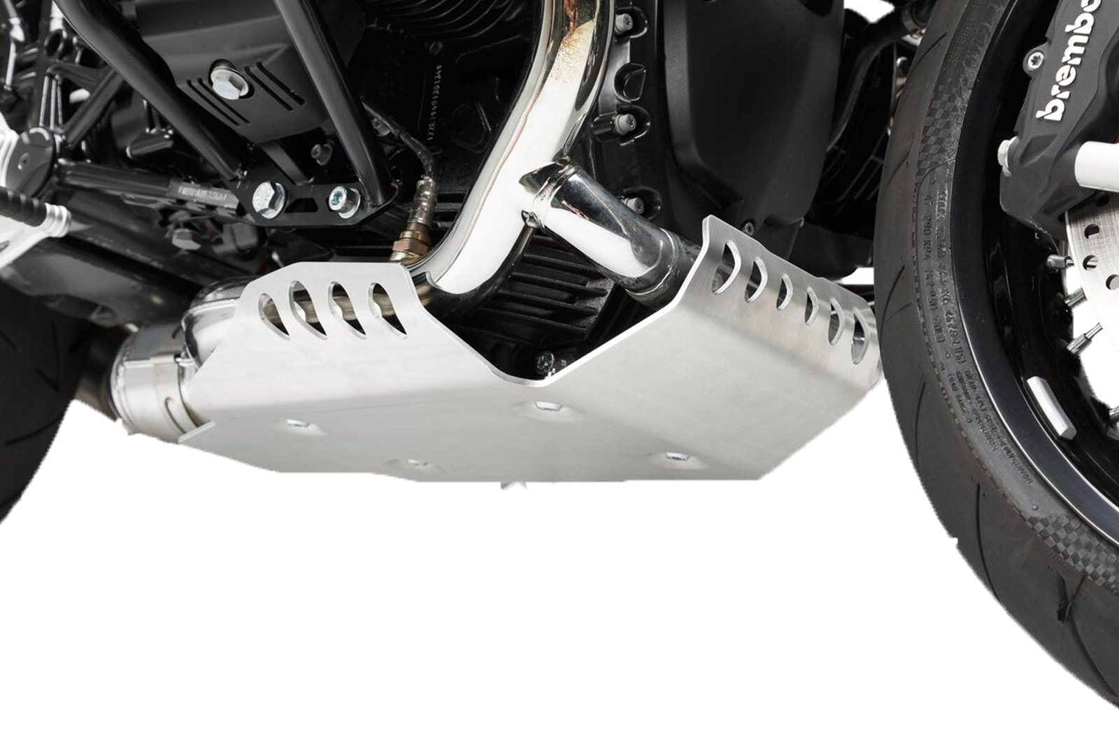 La protection moteur SW-MOTECH offre une protection supplémentaire contre les projections de pierres et le contact involontaire avec le sol, tout en conférant à la moto une touche d'audace. La construction solide en aluminium, assortie au design de la moto naked, dispose d'entrées d'air pour la ventilation du bloc moteur, une suspension amortie en caoutchouc sert à réduire les vibrations. La protection du moteur de 4 millimètres d'épaisseur se fixe facilement aux points de fixation d'origine, sans perçage ni soudure, grâce aux éléments de montage en acier fournis sur mesure.