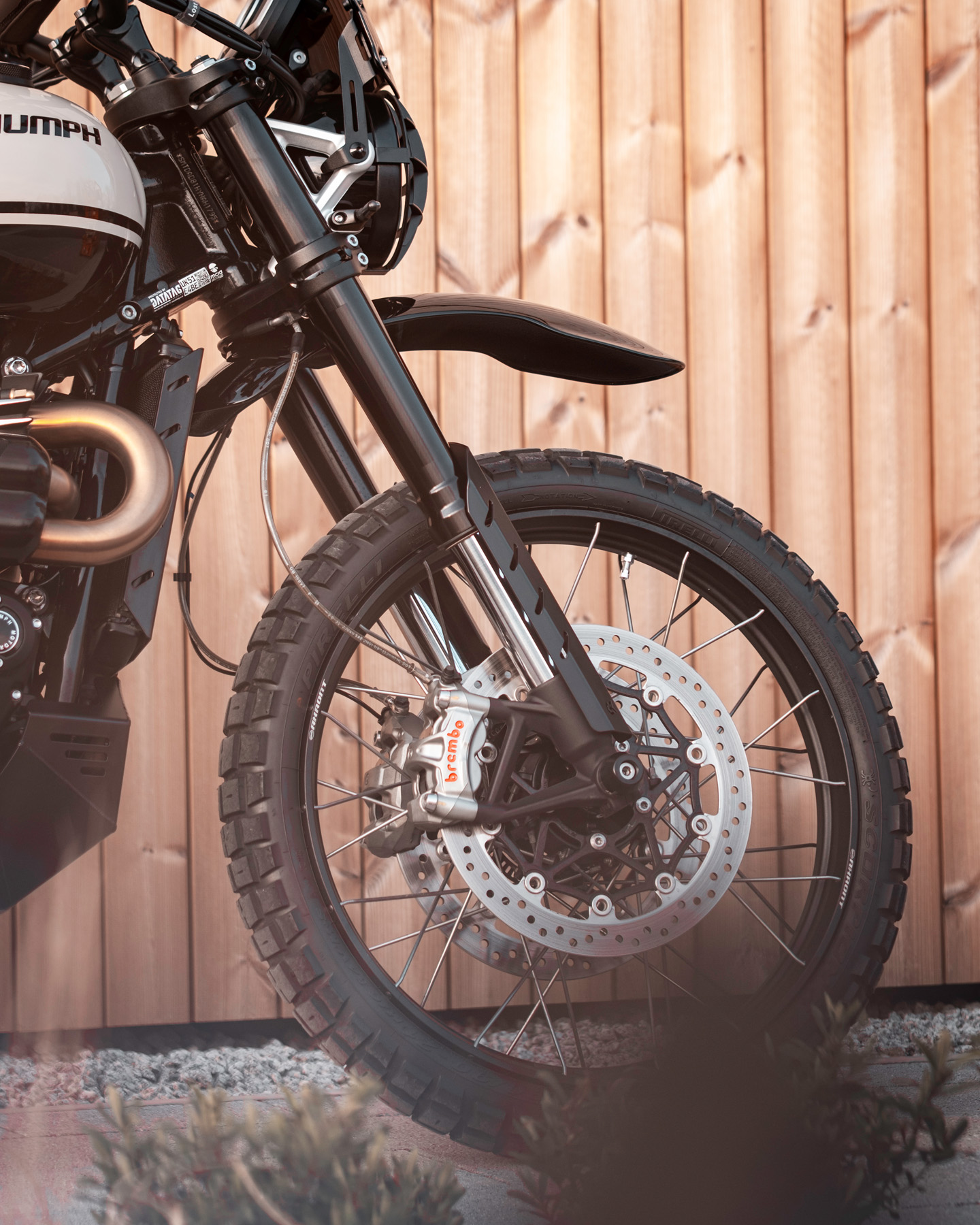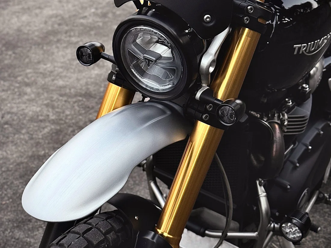Sur une Scrambler, il est tout simplement indispensable de monter le garde-boue en haut (sous le té de fourche). C'est la seule façon de donner à la moto le look off road dont elle a besoin pour être vraiment cool !
