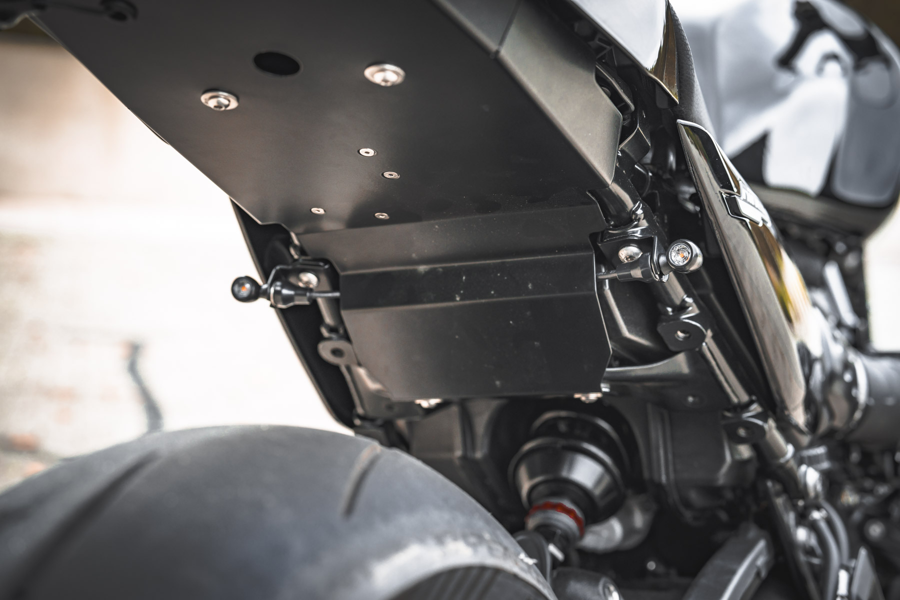 o altri kit posteriori in cui la carenatura inferiore in plastica originale viene rimossa e la filettatura dell'indicatore di direzione è visibile sul telaio.
