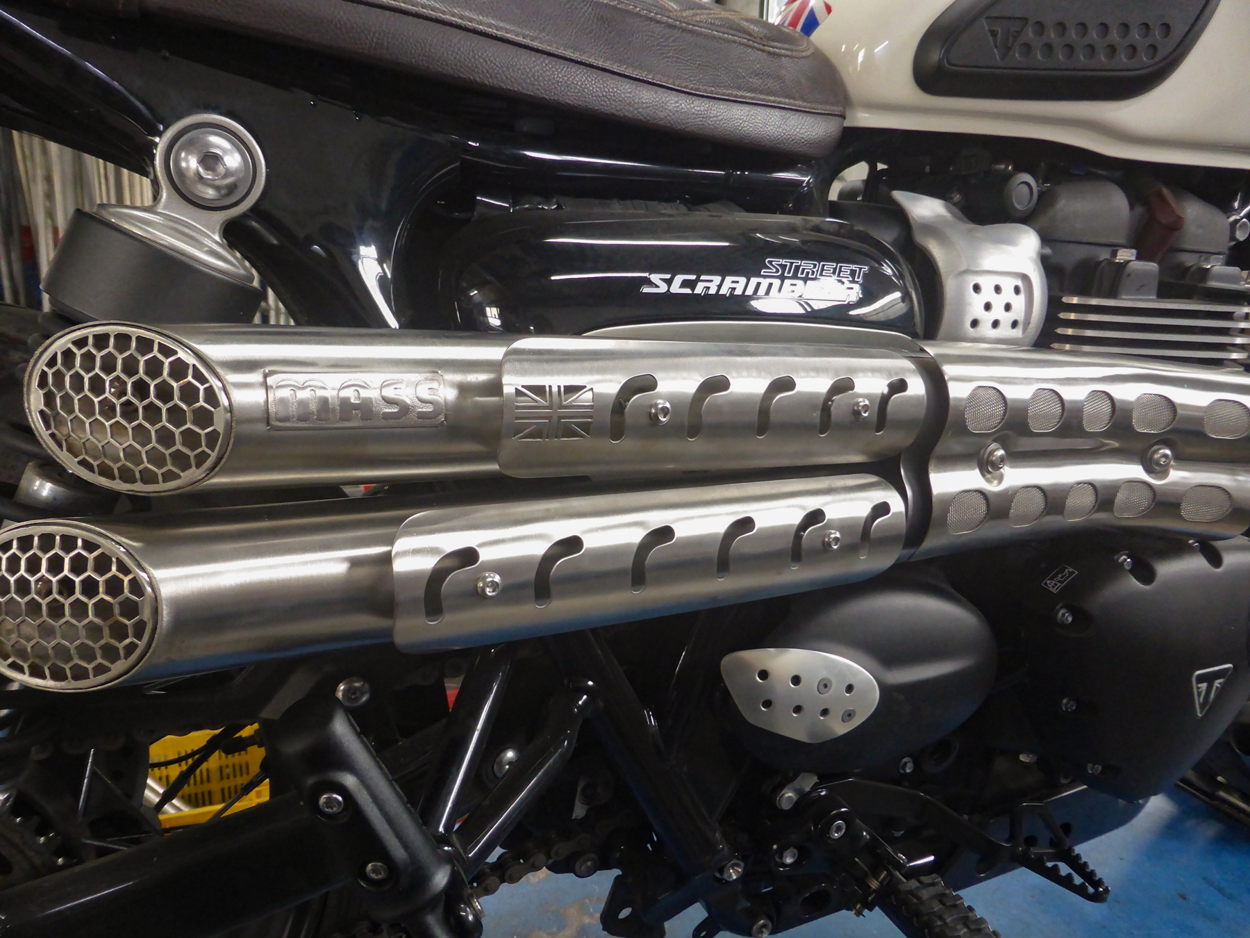 Sistema di scarico completo Mohave in acciaio inox per tutte le Triumph Street Scrambler con numero E.